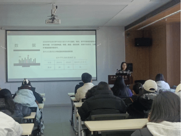 矫海燕结合学院学风建设的总体要求,以生动的案例、详实的数据,为大家详细说明学生违纪处分的相关规定,提醒同学们严守考试纪律,守好底线、红线,摒弃侥幸心理。学院学生会主席团成员王进朝作为学生代表发起诚信考试倡议,号召大家合理规划复习、坚持独立思考、坚守诚信品质,用诚信彰显青春底色,做守规矩、讲诚信的大学生。